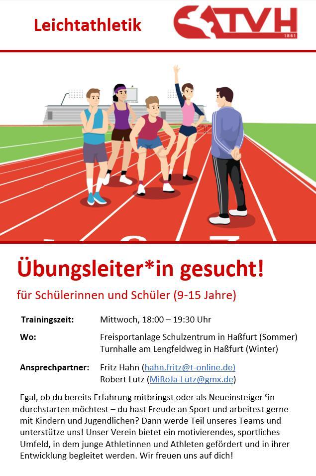 Die Abteilung Leichtathletik sucht einen neuen Übungsleiter für Sportlerinnen und Sportler zwischen 9-15 Jahre. Interessierte mit und ohne ÜL-Erfahrung können sich gerne bei Fritz-Josef Hahn (Abteilungsleiter) Email: hahn.fritz@t-online.de melden.